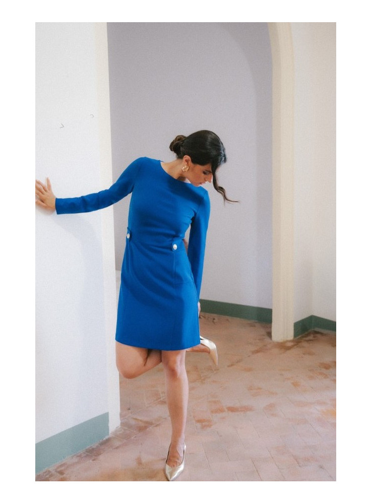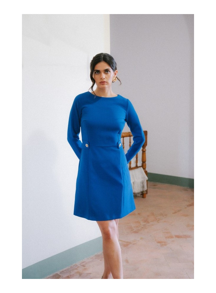 S419 Suknelė su dekoratyvinėmis sagomis ties juosmeniu - rugiagėlių spalvos