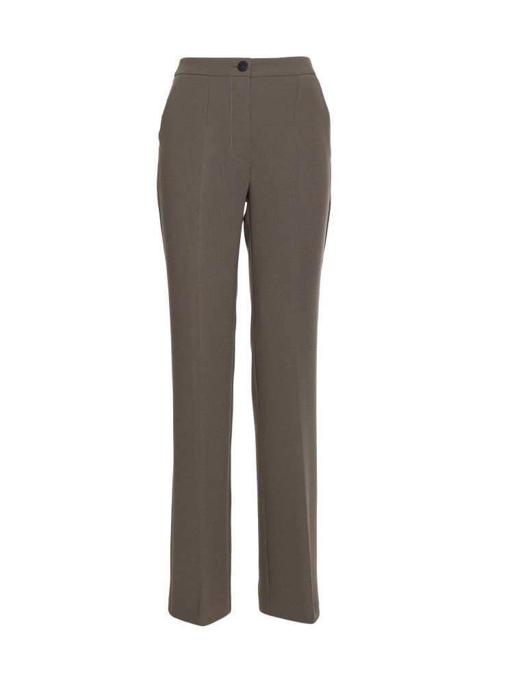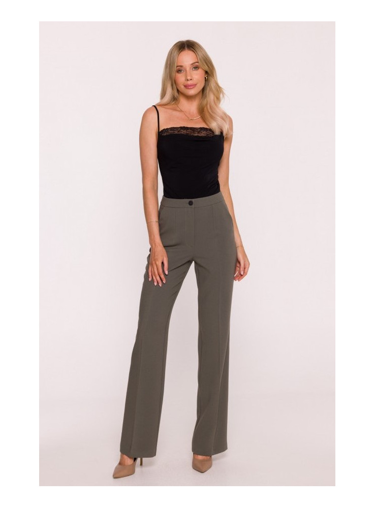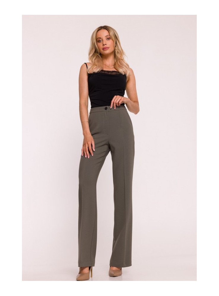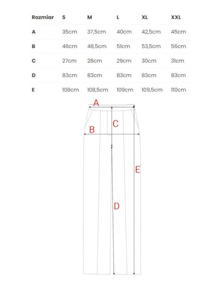 63 % poliesterio 33 % viskozės 4 % elastano MATERIALAS Medžiaga: lygus minkštas audinys INFORMACIJA APIE GAMINĮ Būklė: vidutinė Užsegimas: priekyje užsegamas sagomis ir paslėptu užtrauktuku Kišenės: šoninės kišenės Kojinės: ilgos, tiesios, užspaudžiami kraštai Pamušalas: be pamušalo Modelis: S418 Sukurta ir siūta Lenkijoje Modelis yra 174 cm ūgio, dėvi S dydžio drabužius MADA IR KIRPIMAS Kirpimas: klasikinės kostiumo kelnės Forma: prigludusios prie liemens ir klubų, tiesios kojos Ilgis: iki žemės