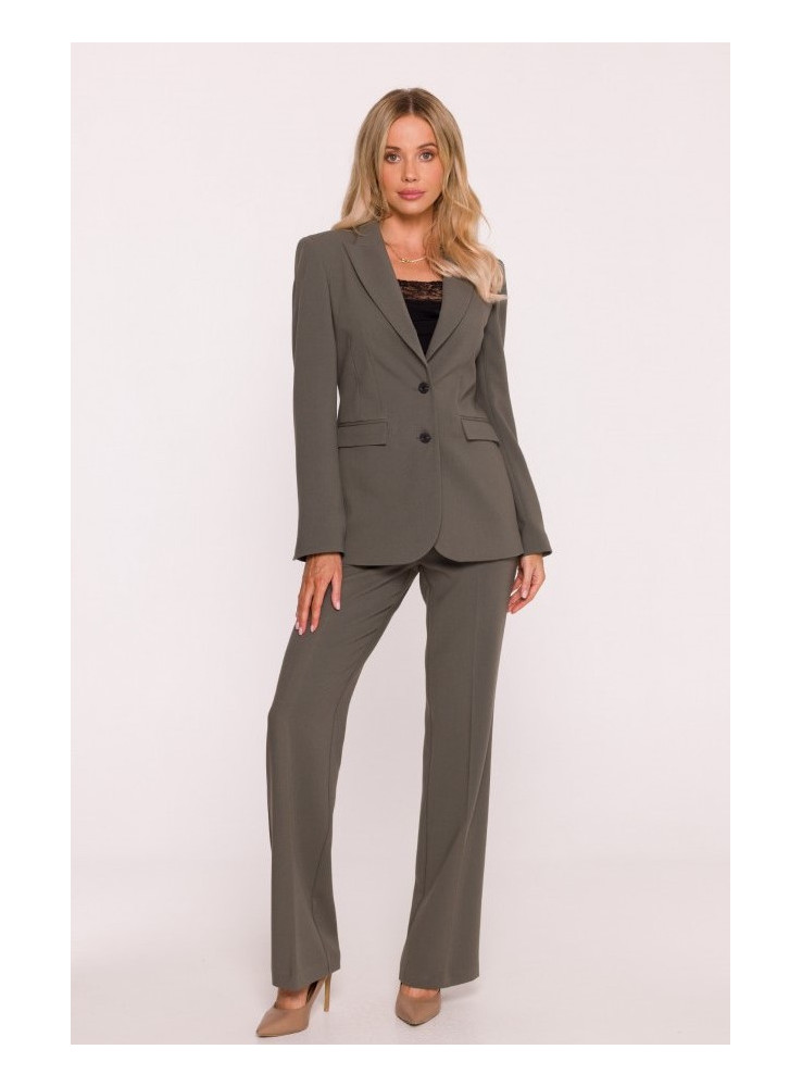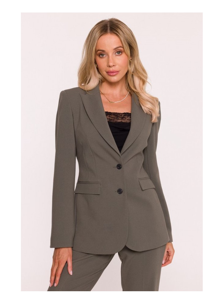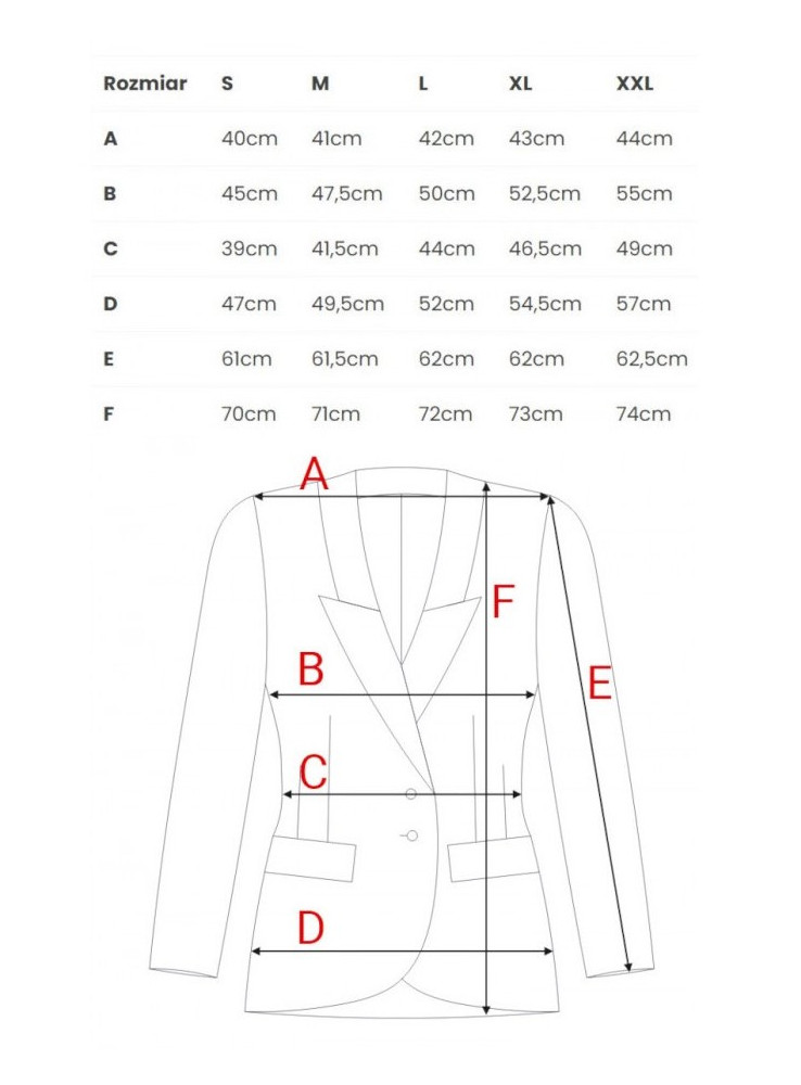 PAGRINDO AUDINYS 63 % poliesteris 33 % viskozės 4% elastano VĖLIAVA 100% poliesteris MATERIALAS Medžiaga: lygus minkštas audinys INFORMACIJA APIE GAMINĮ Apykaklė: klasikinė su rankomis užbaigtais atvartais Užsegimas: vienspalvis, su sagomis Juosmuo: platus liemuo, priekyje ir nugaroje susiuvinėtas Rankovės: ilgos, siauros Pamušalas: su pamušalu Modelis: S417 Sukurta ir siūta Lenkijoje Modelis yra 174 cm ūgio, dėvi S dydžio drabužius MADA IR KIRPIMAS Kirpimas: vienspalvis, prigludęs, prigludusio kirpimo švarkas Forma: tiesi, su aiškiai išreikšta liemens linija Ilgis: siekia žemiau juosmens linijos