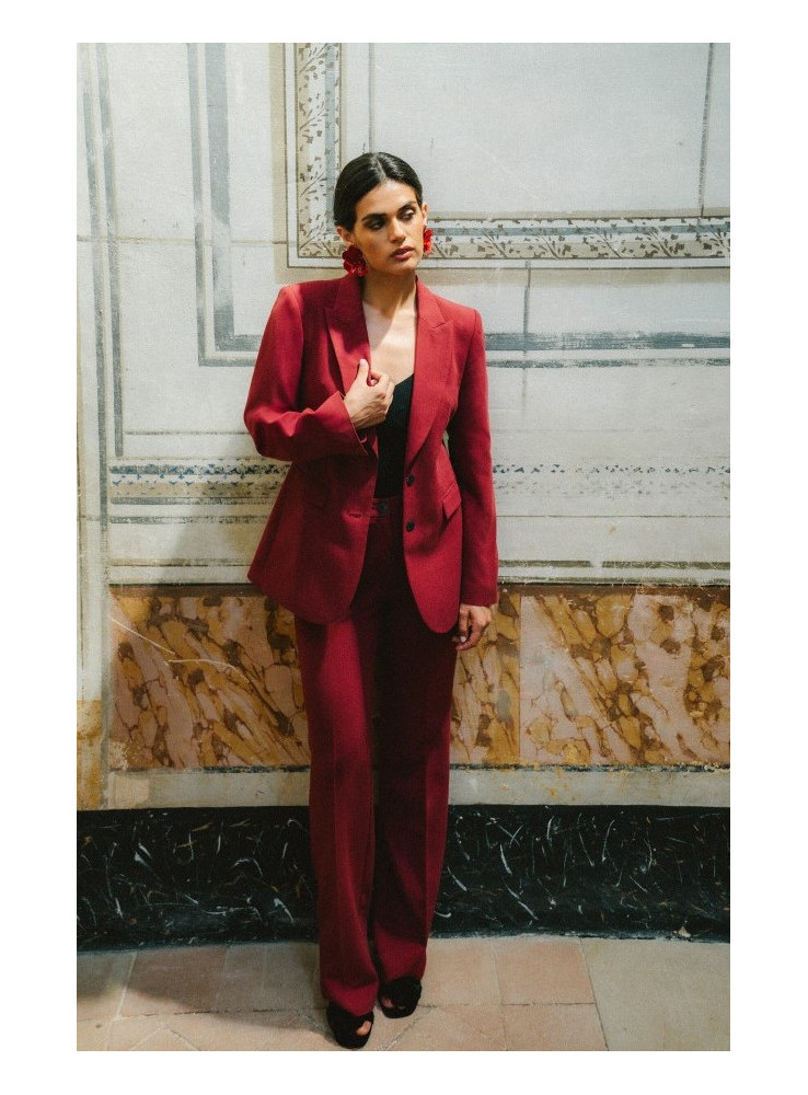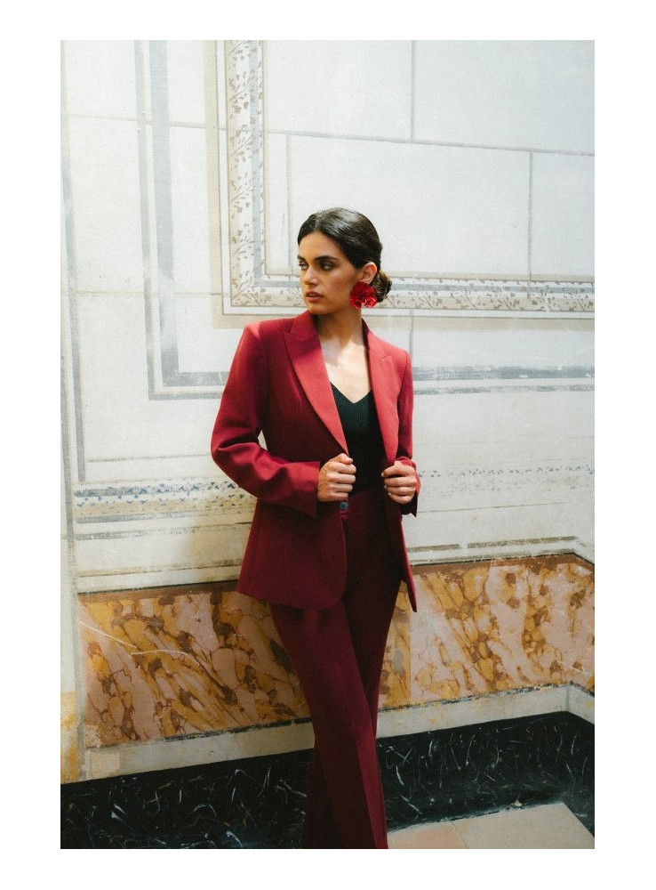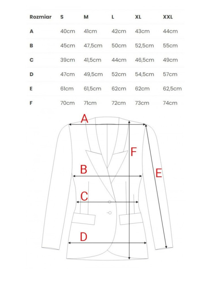 PAGRINDO AUDINYS 63 % poliesteris 33 % viskozės 4% elastano VĖLIAVA 100% poliesteris MATERIALAS Medžiaga: lygus minkštas audinys INFORMACIJA APIE GAMINĮ Apykaklė: klasikinė su rankomis užbaigtais atvartais Užsegimas: vienspalvis, su sagomis Juosmuo: platus liemuo, priekyje ir nugaroje susiuvinėtas Rankovės: ilgos, siauros Pamušalas: su pamušalu Modelis: S417 Sukurta ir siūta Lenkijoje Modelis yra 174 cm ūgio, dėvi S dydžio drabužius MADA IR KIRPIMAS Kirpimas: vienspalvis, prigludęs, prigludusio kirpimo švarkas Forma: tiesi, su aiškiai išreikšta liemens linija Ilgis: siekia žemiau juosmens linijos