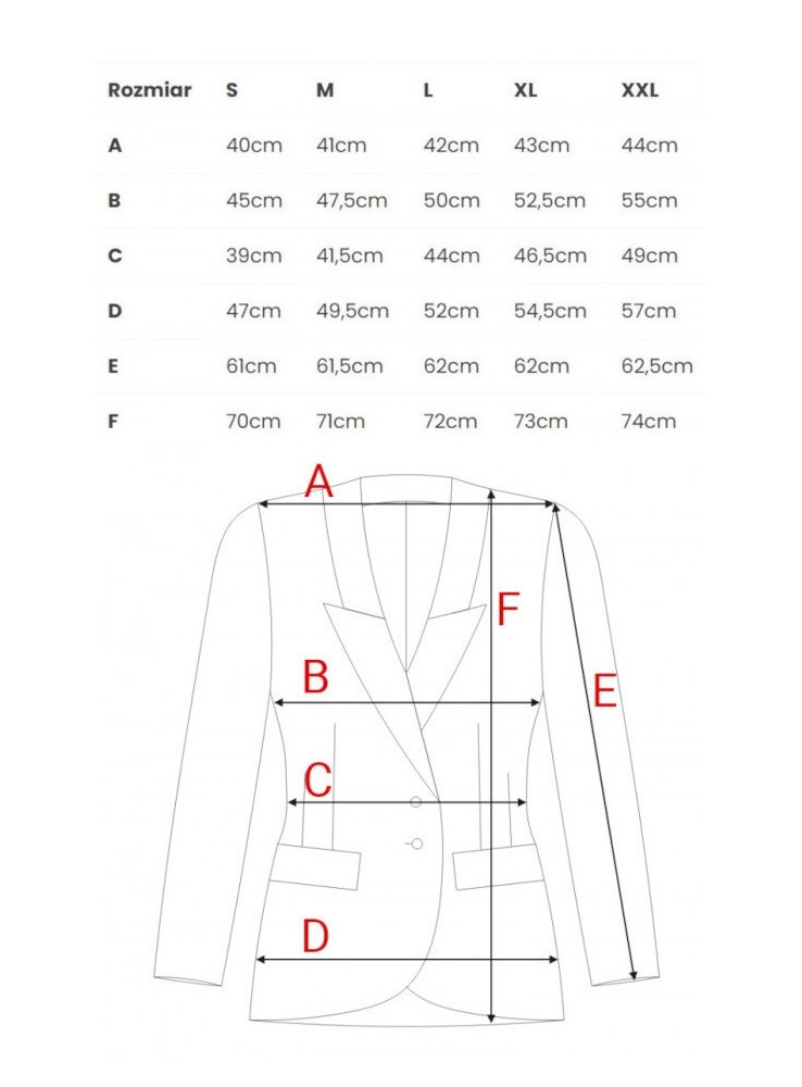 PAGRINDO AUDINYS 63 % poliesteris 33 % viskozės 4% elastano VĖLIAVA 100% poliesteris MATERIALAS Medžiaga: lygus minkštas audinys INFORMACIJA APIE GAMINĮ Apykaklė: klasikinė su rankomis užbaigtais atvartais Užsegimas: vienspalvis, su sagomis Juosmuo: platus liemuo, priekyje ir nugaroje susiuvinėtas Rankovės: ilgos, siauros Pamušalas: su pamušalu Modelis: S417 Sukurta ir siūta Lenkijoje Modelis yra 174 cm ūgio, dėvi S dydžio drabužius MADA IR KIRPIMAS Kirpimas: vienspalvis, prigludęs, prigludusio kirpimo švarkas Forma: tiesi, su aiškiai išreikšta liemens linija Ilgis: siekia žemiau juosmens linijos