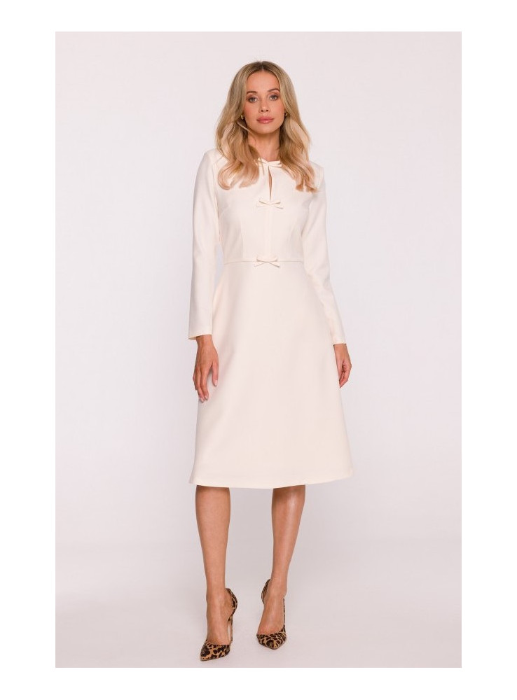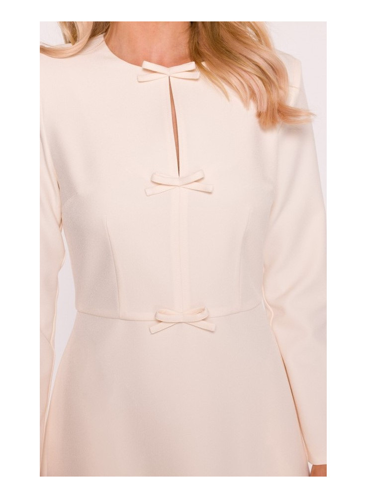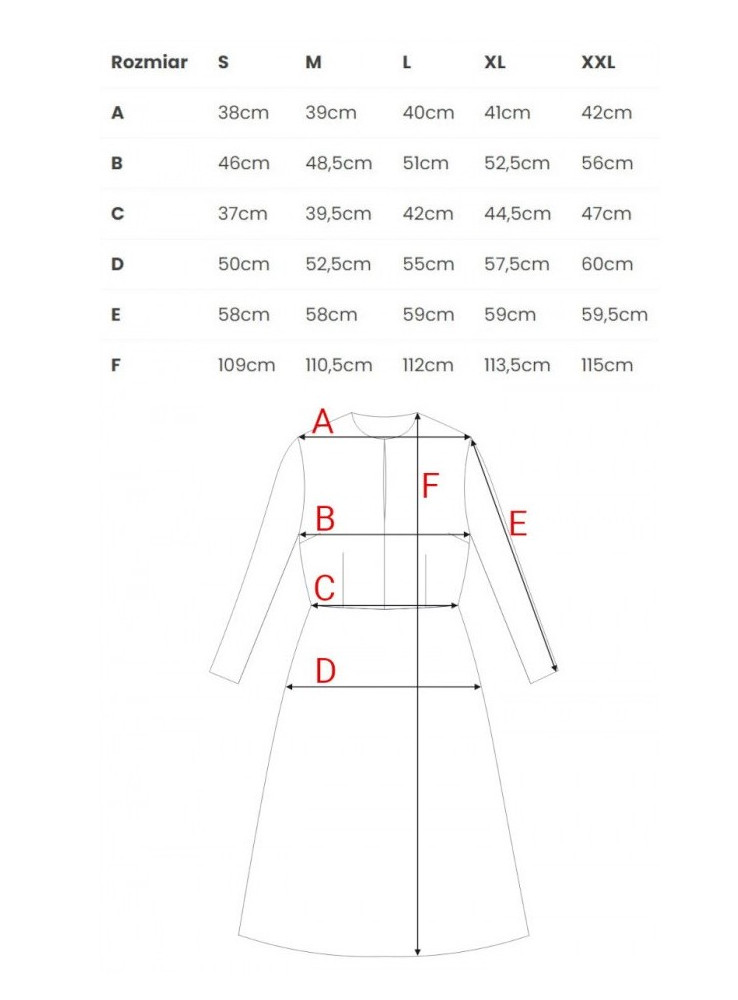 PAGRINDO AUDINYS 97 % poliesteris 3 % elastano MATERIALAS Medžiaga: lygus audinys INFORMACIJA APIE GAMINĮ Iškirptė: pusapvalė iškirptė, apačioje suskaidyta Rankovės: ilgos Kišenės: nėra Užsegimas: užtrauktukas nugaroje Pamušalas: su pamušalu Modelis: S414 Sukurta ir siūta Lenkijoje Modelis yra 174 cm ūgio, dėvi S dydžio drabužius MADA IR KIRPIMAS Kirpimas: trapecijos formos kirpimas su dekoratyviniais lankeliais priekyje Forma: laisva A raidės formos, laisva ties klubais Ilgis: virš kelių