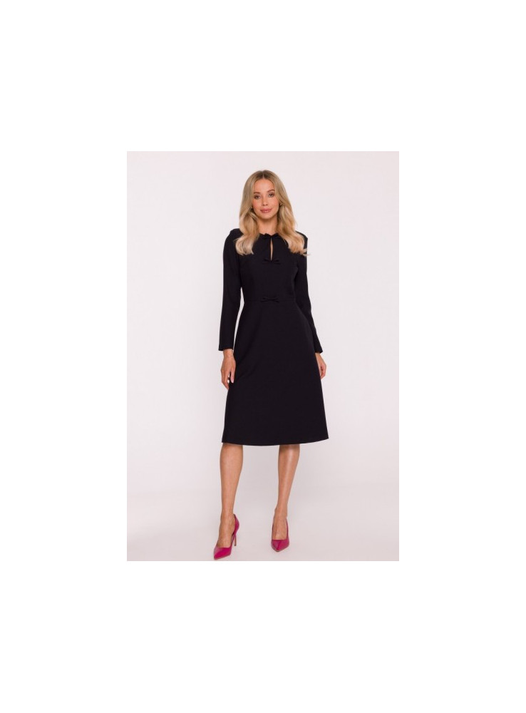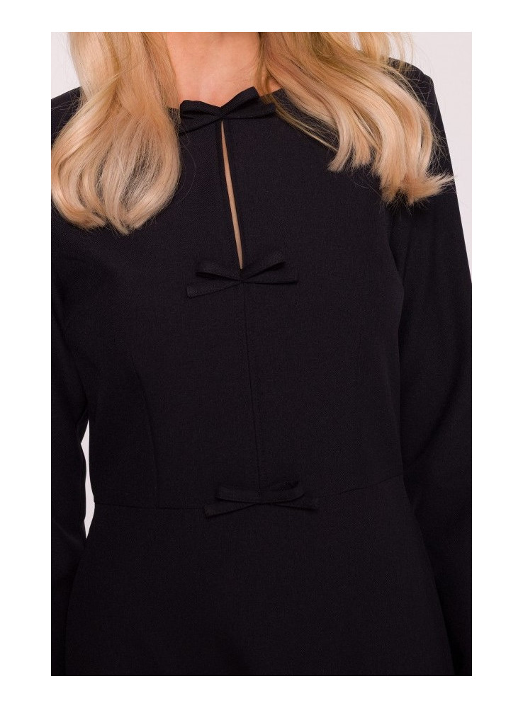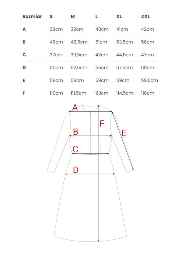 97 % poliesteris 3% elastano MATERIALAS Medžiaga: lygus melanžo struktūros audinys INFORMACIJA APIE GAMINĮ Iškirptė: pusapvalė iškirptė, apačioje suskaidyta Rankovės: ilgos Kišenės: šoninėse siūlėse Priedai: lankeliai priekyje, viduryje Užsegimas: užtrauktukas nugaroje Pamušalas: be pamušalo Modelis: S413 Sukurta ir siūta Lenkijoje Modelis yra 174 cm ūgio, dėvi S dydžio drabužius MADA IR KIRPIMAS Kirpimas: trapecijos formos kirpimas su dekoratyviniais lankeliais priekyje Forma: laisva A raidės formos, laisva ties klubais Ilgis: virš kelių