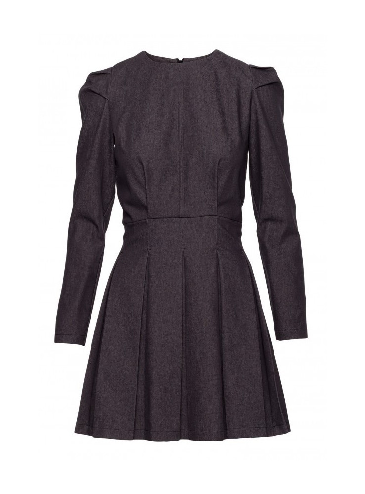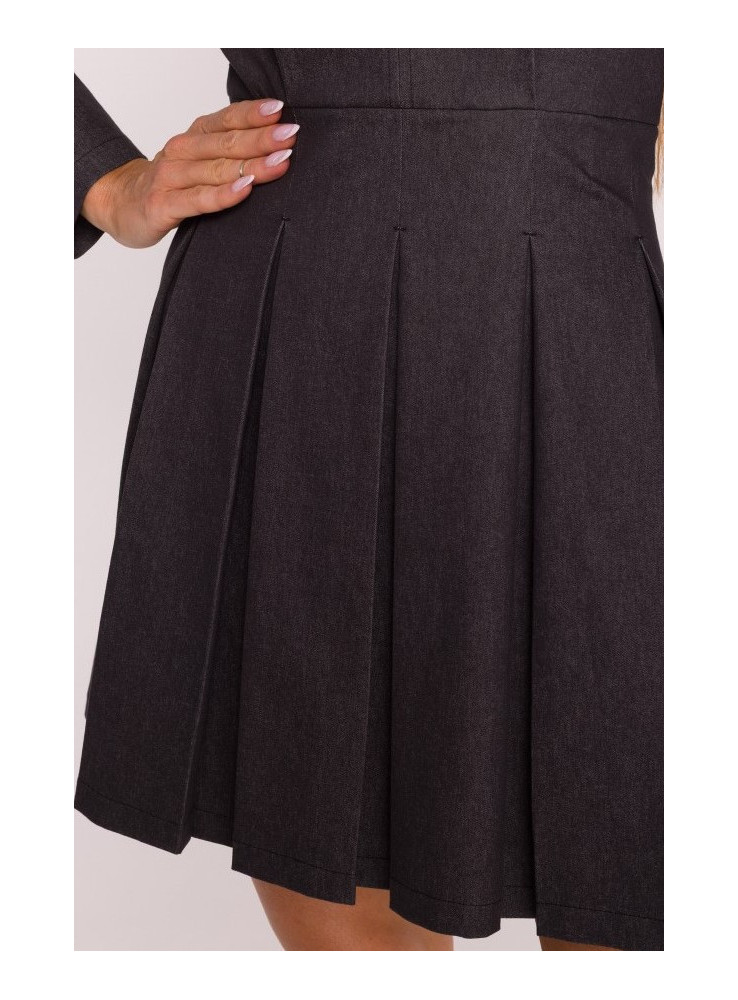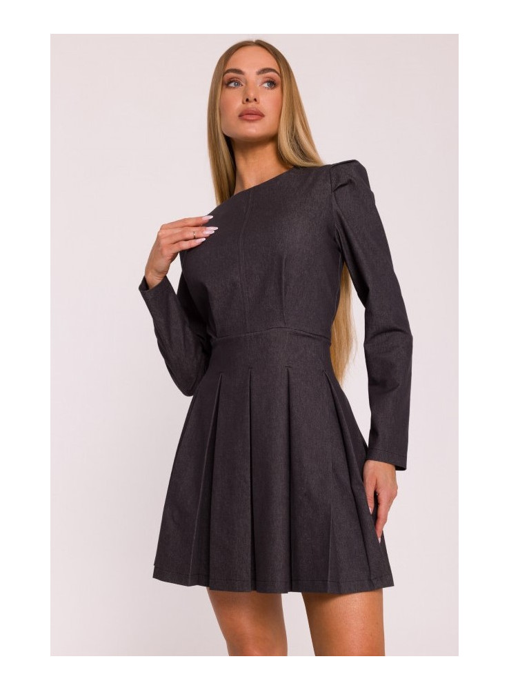 76 % medvilnės 21% poliesteris 3% elastano MATERIALAS Medžiaga: džinsą imituojantis audinys - šiek tiek standus, matinis, šiek tiek elastingas INFORMACIJA APIE GAMINĮ Iškirptė: apvali, klasikinė Rankovės: ilgos, su klostėmis ant pečių Užsegimas: užtrauktukas nugaroje Kišenės: be kišenių Pamušalas: nėra Modelis: M884 Sukurta ir siūta Lenkijoje Nuotraukoje pavaizduotas modelis yra 171 cm ūgio, dėvi S dydžio drabužius MADA IR KIRPIMAS Kirpimas: prigludusi viršutinė dalis, platėjanti apatinė dalis su kontrastingomis klostėmis Forma: pabrėžtas liemuo, išryškinti pečiai Ilgis: mini