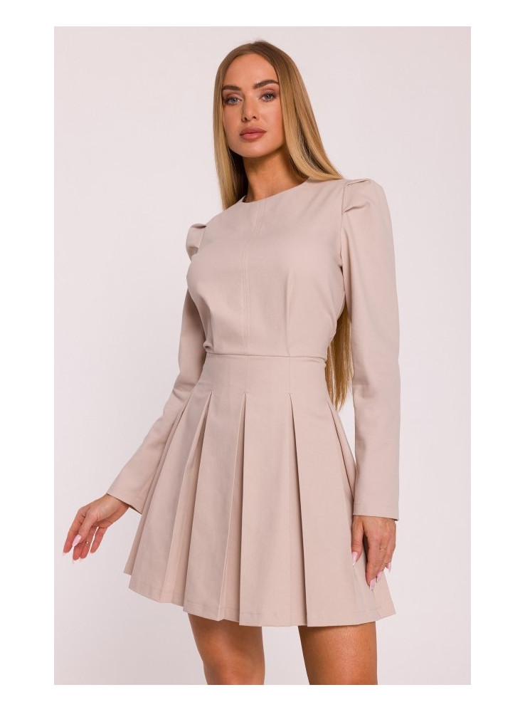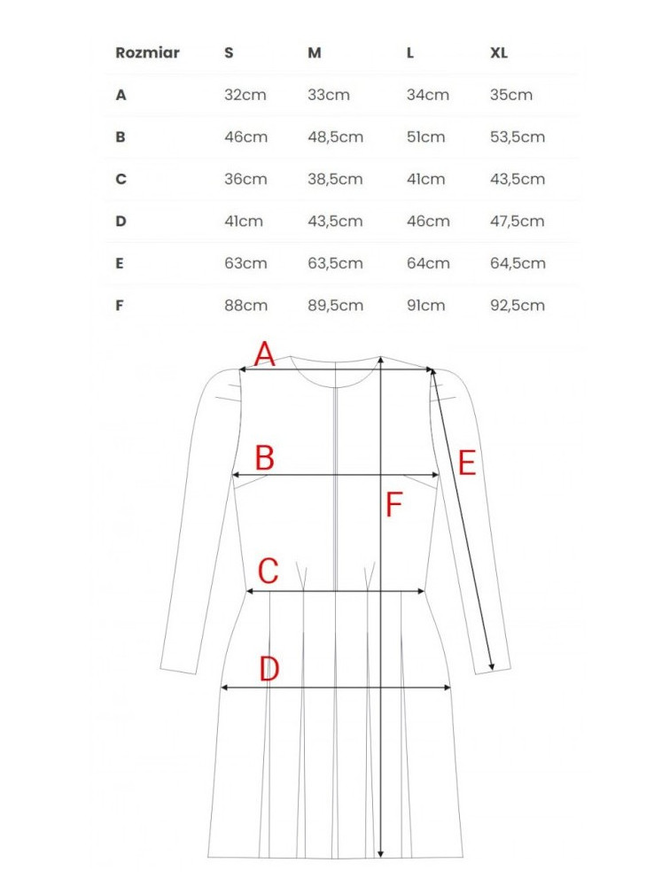 76 % medvilnės 21% poliesteris 3% elastano MATERIALAS Medžiaga: džinsą imituojantis audinys - šiek tiek standus, matinis, šiek tiek elastingas INFORMACIJA APIE GAMINĮ Iškirptė: apvali, klasikinė Rankovės: ilgos, su klostėmis ant pečių Užsegimas: užtrauktukas nugaroje Kišenės: be kišenių Pamušalas: nėra Modelis: M884 Sukurta ir siūta Lenkijoje Nuotraukoje pavaizduotas modelis yra 171 cm ūgio, dėvi S dydžio drabužius MADA IR KIRPIMAS Kirpimas: prigludusi viršutinė dalis, platėjanti apatinė dalis su kontrastingomis klostėmis Forma: pabrėžtas liemuo, išryškinti pečiai Ilgis: mini