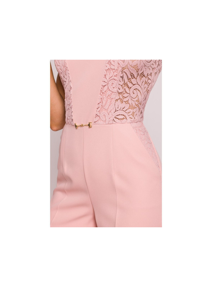 Nėriniai: sudėtis: 90 % nailono 10% spandekso Pagrindo audinys: medžiaga: 95% poliesteris 5% elastano MATERIALAS Medžiaga: lygus audinys; nėrinių intarpai šonuose INFORMACIJA APIE GAMINĮ Iškirptė: integruota, suapvalinta Rankovės: be rankovių Užsegimas: paslėptas užtrauktukas nugaroje Juosmuo: pabrauktas, priekyje - metalinis papuošimas Kišenės: be kišenių Kojos: ilgos, plačios, klostuotos Modelis: M866 Sukurta ir siūta Lenkijoje Nuotraukoje pavaizduotas modelis yra 171 cm ūgio, dėvi S dydžio drabužius MADA IR KIRPIMAS Kirpimas: prigludusi viršutinė dalis ir laisvos, elegantiškos kojos Forma: prigludusi, su figūrą prilaikančiais geometriniais nėrinių skydeliais Ilgis: ilgos kojos
