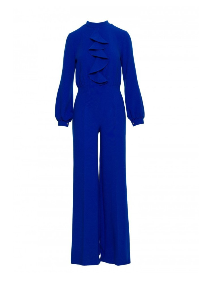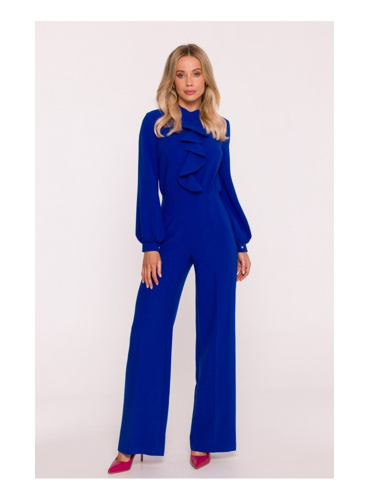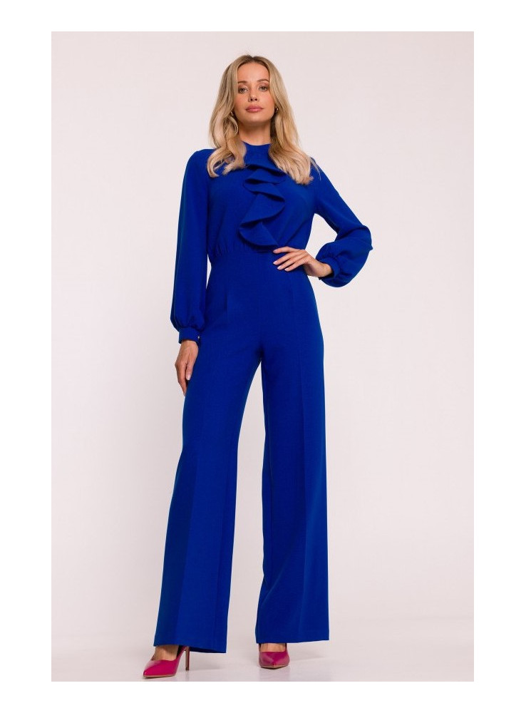 63 % poliesterio 33 % viskozės 4 % elastano MATERIALAS Medžiaga: lygus minkštas audinys INFORMACIJA APIE GAMINĮ Iškirptė: stovo formos apykaklė, iškirptė Rankovės: ilgos, šiek tiek pūstos, užbaigtos rankogaliais, užsegamais dekoratyvinėmis sagomis Kojinės: tiesios, ilgos, klostuotos Liemuo: paryškintas Užsegimas: paslėptas užtrauktukas nugaroje Modelis: S420 Sukurta ir siūta Lenkijoje Modelis yra 174 cm ūgio, dėvi S dydžio drabužius MADA IR KIRPIMAS Kirpimas: klasikinis vientisas kostiumas Forma: prigludusi viršutinė dalis su švarku, laisvesnės kojos Ilgis: iki žemės
