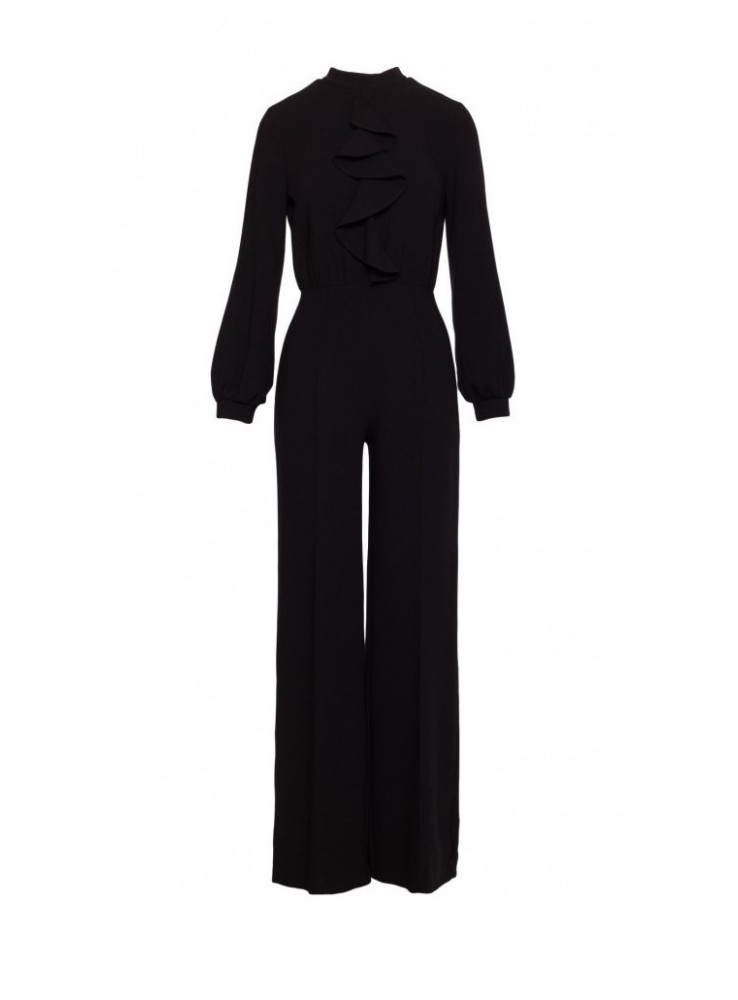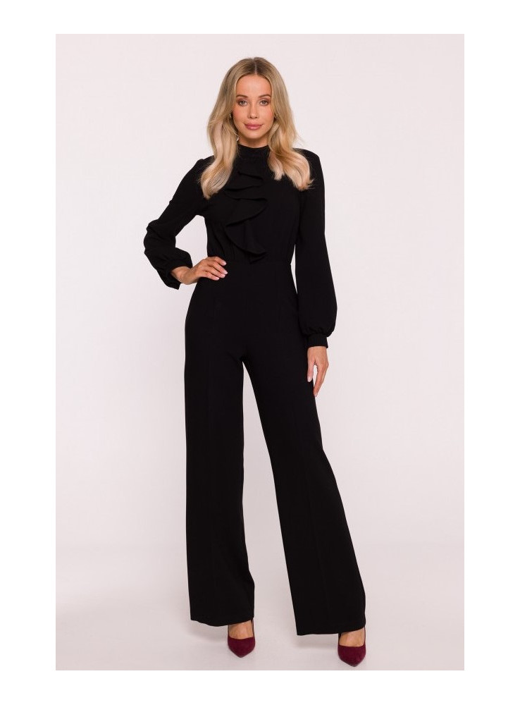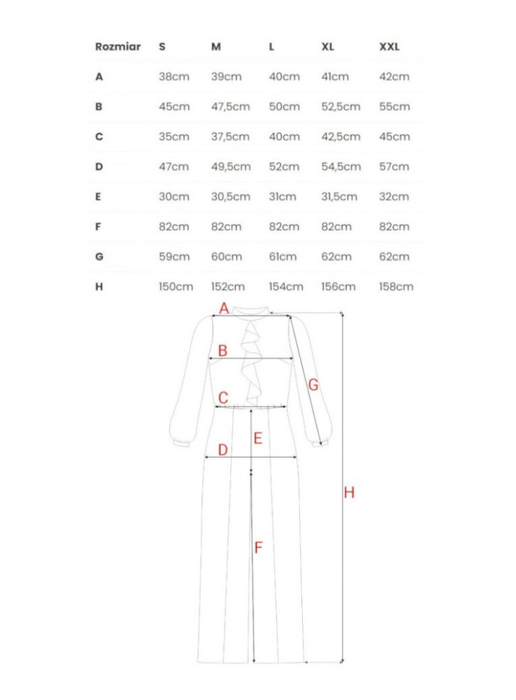 63 % poliesterio 33 % viskozės 4 % elastano MATERIALAS Medžiaga: lygus minkštas audinys INFORMACIJA APIE GAMINĮ Iškirptė: stovo formos apykaklė, iškirptė Rankovės: ilgos, šiek tiek pūstos, užbaigtos rankogaliais, užsegamais dekoratyvinėmis sagomis Kojinės: tiesios, ilgos, klostuotos Liemuo: paryškintas Užsegimas: paslėptas užtrauktukas nugaroje Modelis: S420 Sukurta ir siūta Lenkijoje Modelis yra 174 cm ūgio, dėvi S dydžio drabužius MADA IR KIRPIMAS Kirpimas: klasikinis vientisas kostiumas Forma: prigludusi viršutinė dalis su švarku, laisvesnės kojos Ilgis: iki žemės