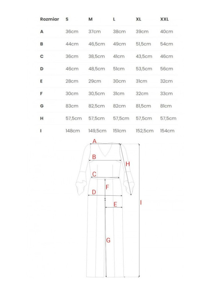 63 % poliesterio 33 % viskozės 4 % elastano MATERIALAS Medžiaga: lygus minkštas audinys INFORMACIJA APIE GAMINĮ Iškirptė: V formos Rankovės: 7/8 ilgio, su raukiniais Kojinės: tiesios, klostuotos Juosmuo: su diržu ir sagtimi Užsegimas: paslėptas užtrauktukas nugaroje Kišenės: be kišenių Pamušalas: nėra Modelis: S416 Sukurta ir pasiūta Lenkijoje Modelis yra 174 cm ūgio, dėvi S dydžio drabužius MADA IR KIRPIMAS Sukirpimas: moteriškas kombinezonas su dekoratyvinėmis rankovėmis Forma: prigludusi viršutinė dalis, tiesios kojos Ilgis: iki žemės